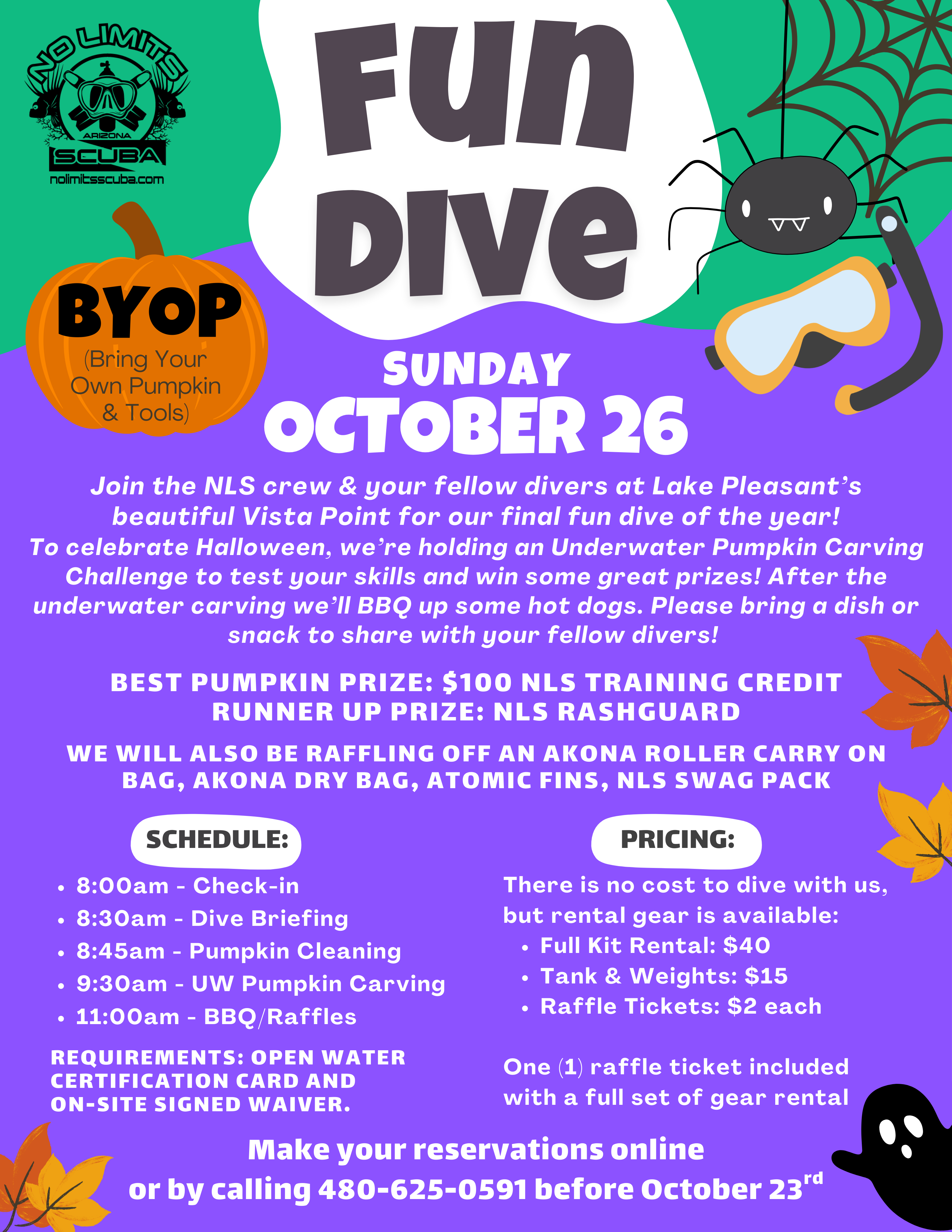 Join the NLS crew & your fellow divers at Lake Pleasant’s beautiful Vista Point for our final fun dive of the year! To celebrate Halloween, we’re holding an Underwater Pumpkin Carving Challenge to test your skills and win some great prizes!